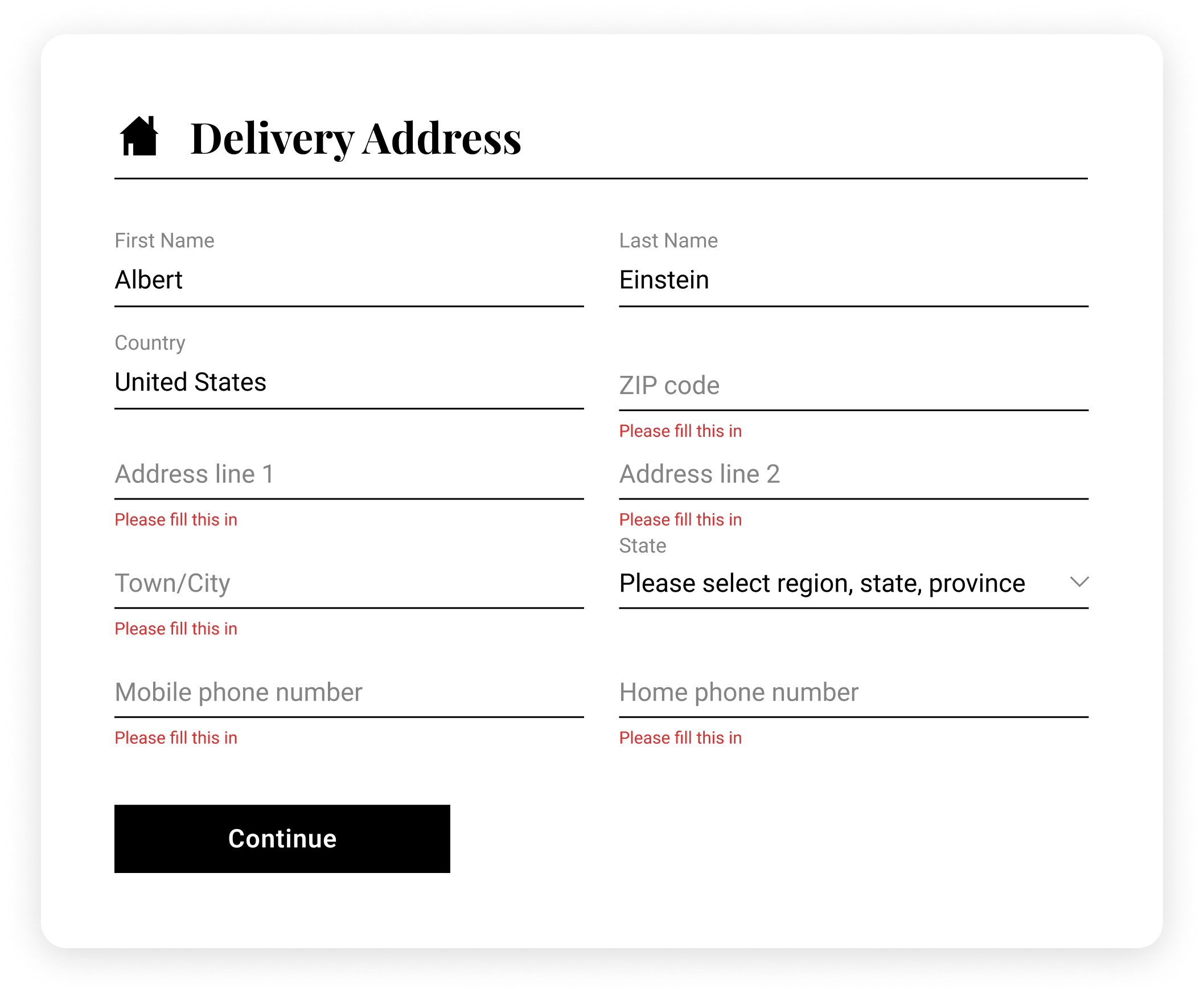 Validation error messages were shown for missing fields and incorrect input, instead of only showing after submission.